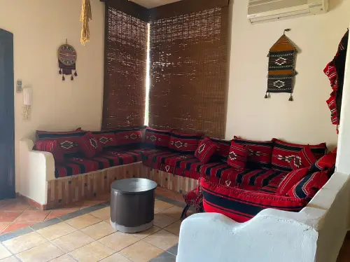 طابق الاول: مجلس عربي- صالون -غرفة صفرى- حمام- مطبخ- تراس.