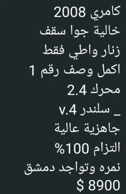 كامري ...2008....خالية برا جوا ....محرك ودوزان ذهب ....جاهزية فنية وميكانيكية عالية جدا .....لحق حالك واغتنم الفرصة .....عمر ...25/9.....البيع للراغب فقط ....نعتذر من الوسطاء ....عمولة من الشاري .....شكرا لتفهمكم ...........تخباتي
