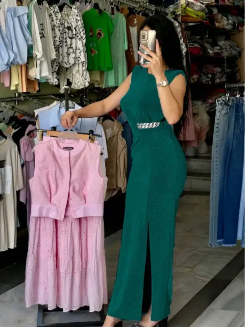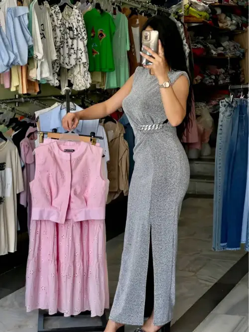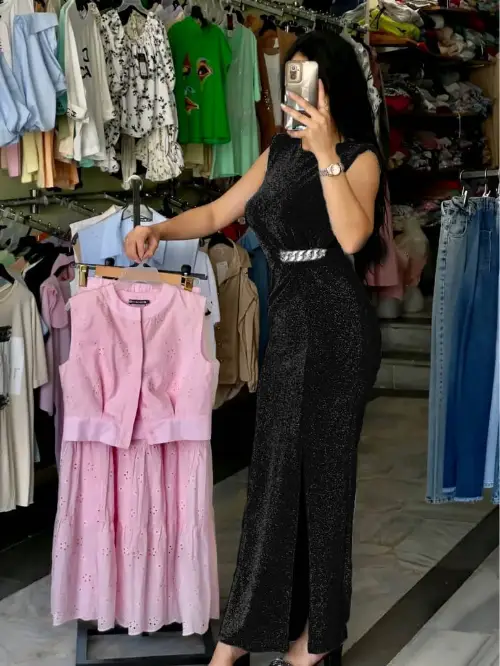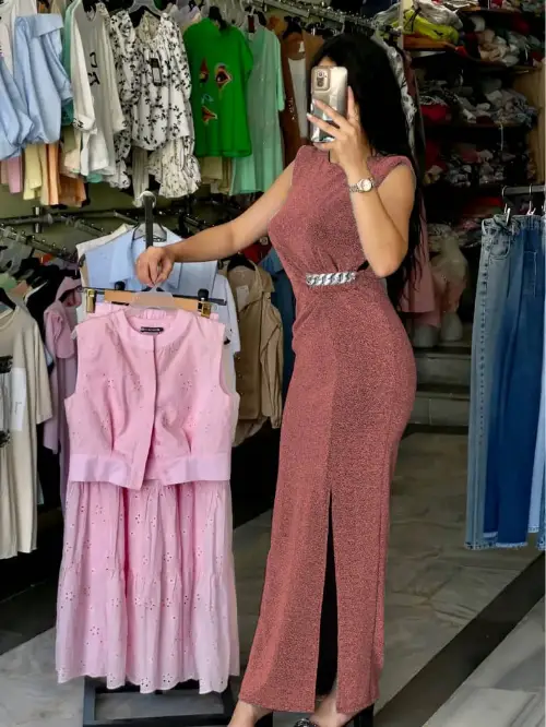 فستان طويل قماش لامية قصب السكر مع جنزير عالخصر فري سايز بلبس من 38 لل 46 الوان الصور 6 الوان نيلي. اسود .احمر تركواز .رماني.فضي السعر