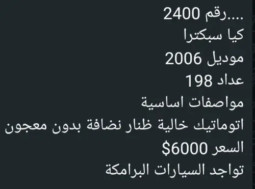سبيكترا ...2006...خالية برا جوا ....محرك ودوزان ذهب ....جاهزية عالية جدا ......خاليىدة برا جوا ....نظافة تامة .....مح....28/9....البيع للراغب فقط ...نعتذر من الوسطاء والمكاتب ...عمولة من الشاري ...شكرا لتفهمكم .........للجاديييين فقط .....