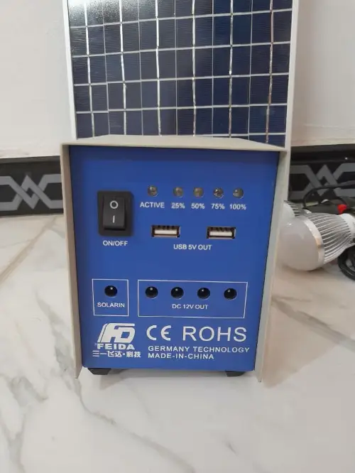 منظم ماركة FEIDA تقنية ألمانية 🇩🇪 مع لوح طاقة شمسية 15 واط ☀️ مقاس { 25 × 40 } سم - كبل 10 متر 🎗 مناسب للمزارع ورحلات التخييم ❤️ بطارية أسيد داخلية 5 أمبير 🔋 كافية للتشغيل حوالي 6 ساعات ⏰ لمبات 13 واط مع كبل 5 متر عدد 2 💡 مخرجين Usp للاستخدامات المختلفة ✅ توصيل ضمن الشام وشحن للمحافظات 🚌