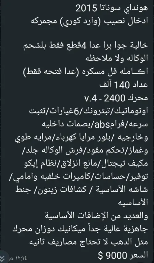 سوناتا ....خالي برا جوا ....محرك ودوزان ذهب ......جاهزية عالية ...فنية وميكانية ممتازة ......لحق حالك واغتنم الفرصة ....عمر ...1/10.....جاهزية ممتازة .....للراغب فقط ...نعتذر من الوسطاء والمكاتب ....عمولة من الشاري ......للجادددين فقط ....شكرا لتفهمكم .....