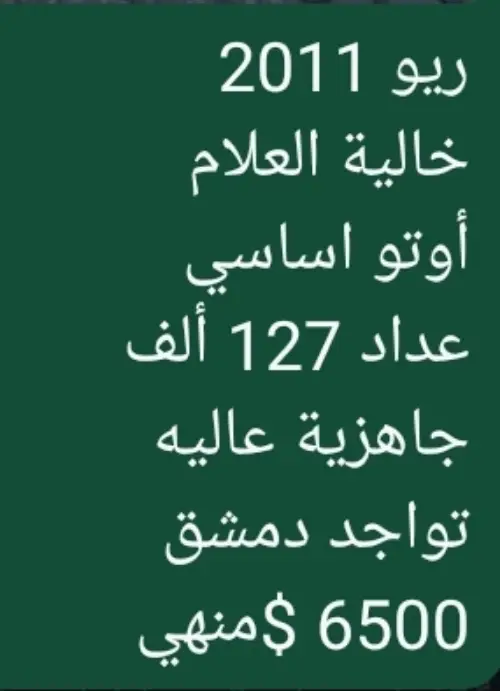 ريو الملكية...خالية برا جوا ...محرك ودوزان ذهب ...جاهزية ممتازة .....نظافة خارقة ....لحق حالك واغتنم الفرصة ...عمر ...2/10...البيع للراغب فقط ....نعتذر من الوسطاء والمكاتب ...عمولة من الشاري .. شكرا لتفهمكم ......للجادييين فقط .....