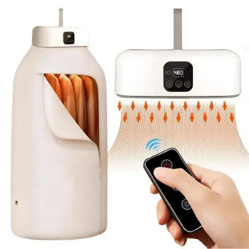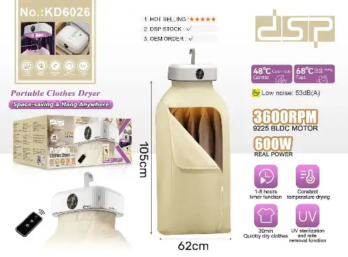 مجفف ملابس محمول ماركة dsp 😍❤️ موديل KD6026 بامتياز فرنسي 🇫🇷 قابل للطي٬ وسهل التخزين في أي مكان 🤗 شاشة LCD - مع جهاز للتحكم عن بعد 📱 محرك باستطاعة 600 واط { فعليّة } 😎 يقوم بالدوران 3600 دورة / الدقيقة 🔄 تسخين سيراميك PTC باستخدام الهواء الساخن 🔥 فعّال في التجفيف السريع والتعقيم وإزالة العثّ ✨ مستوى ضوضاء منخفض : 53 ديسيبل 🤫 مزود بعلّاقة مدمجة لتجفيف 8 قطع معاً 😍 يختلف الوقت وعدد القطع باختلاف الحجم 🤗 1⃣ القمصان والملابس الخفيفة : 8 قطع 👈 يستغرق التجفيف حوالي 30 دقيقة 2⃣ الجواكيت والسترات : 4-5 قطع 👈 يستغرق التجفيف حوالي 2-3 ساعة 3⃣ الأغطية : 3 قطع 👈 يستغرق التجفيف حوالي 3-4 ساعات ❗️الحد الأقصى لسعة التحميل : 10 كيلوغرام❗️ ⭐️ مصمم بوضعين للاستخدام ⭐️ 1⃣ وضع العناية عند درجة °48 سيليزيوس 👈 يقوم بالتجفيف اللطيف بدون إتلاف الملابس مناسب للحرير والملابس المحشوة بالريش 🌸 2⃣ وضع التجفيف السريع عند درجة °68 سيليزيوس 👈 مناسب للقطن والكتان والنايلون... ✅ مزود بشاشة LCD - مع جهاز للتحكم عن بعد 📱 وظيفة ضبط التوقيت : 1 - 8 ساعات ⏰ وظيفة التعقيم بالأشعة فوق البنفسجية ✨ أبعاد الجهاز { الطول 28.5 - العرض 21.5 - الارتفاع 11 } سم 🎗 مزود بغطاء لتغطية الملابس وحصر الهواء 😌 أبعاد الغطاء { الطول 105 - العرض 62 } سم 🎗 توصيل ضمن الشام وشحن للمحافظات 🚌