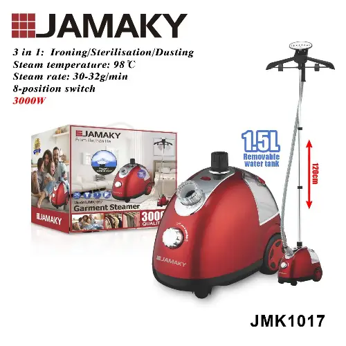 مكواية الملابس والستائر ماركة JAMAKY ❤️ موديل JMK-1017 للكوي بالبخار 💨 عـ الواقف 🤗 استطاعة التسخين خارقة 3000 واط 💪 خزان سعة 1.5 ليتر 💧يسخن خلال 45 ثانية ⏰ قادر على إعطاء 40 دقيقة من البخار المستمر 😍 معدل البخار : 30 - 32 غرام / الدقيقة 💨 درجة حرارة البخار تصل إلى °98 سيلزيوس 🔥 عمود ألمنيوم 1.2 متر قابل للتمدد مع عليقة 👕 لتعليق الملابس وتعريضها للبخار وفرد التجاعيد ✨ أنبوب البخار ثخين 1.45 متر قابل للطي 👌 مزودة بفرشاية لإزالة الزغبر والخيوط بسهولة ✅ توصيل ضمن الشام وشحن للمحافظات 🚌