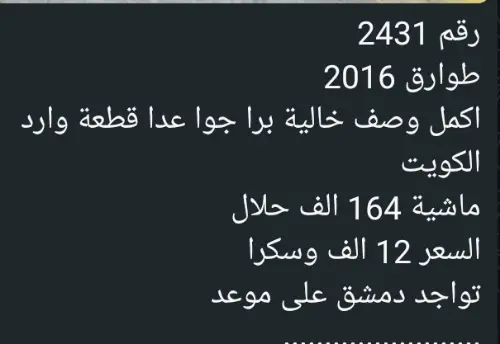 طوارق ...2016.....خالية برا جوا .....محرك ودوزان ذهب ...جاهزية عالية جدا ....لحق حالك واغتنم الفرصة ......مح.س ...13/10....البيع للراغب حصرا ...نعتذر من الوسطاء والمكاتب ....عمولة من الشاري ....شكراااا لتفهمكم ....للجاديين فقط ......