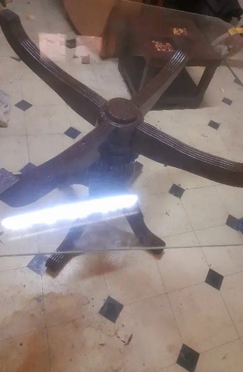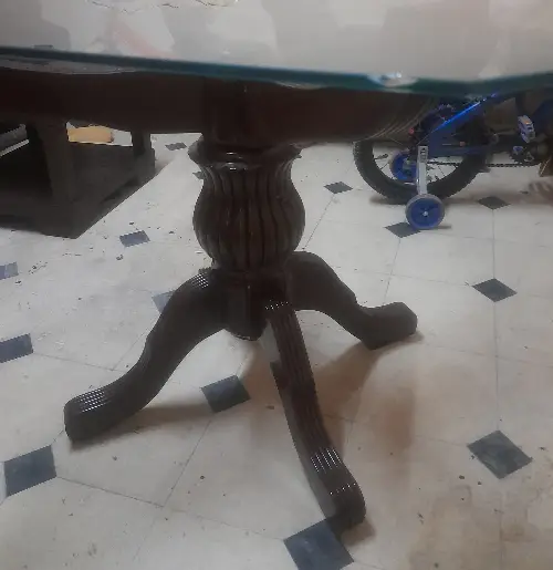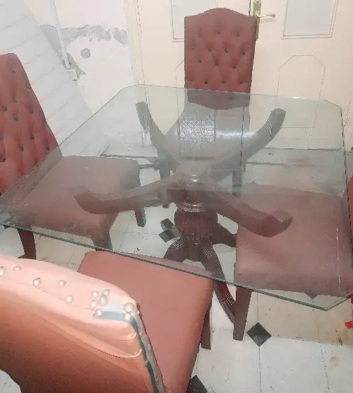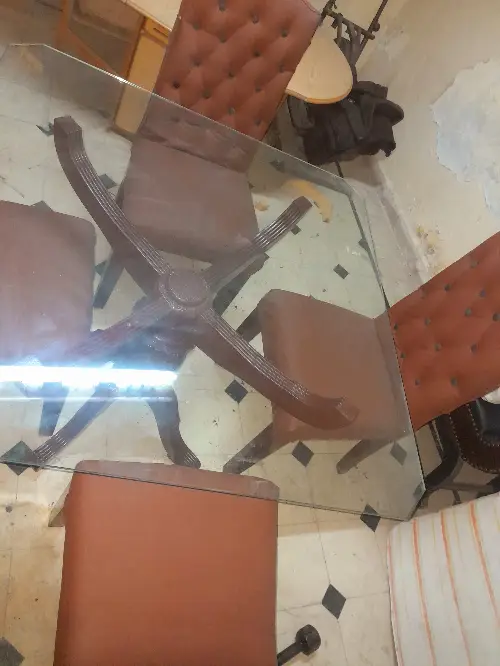 للبيع طاولة قاعدة خشب سطح بلور سميك سكريت طول ١٠٩ سمارتفاع ٧٨سم مع ٤كراسي جلد بني شوكو بسعر (مليونيين)