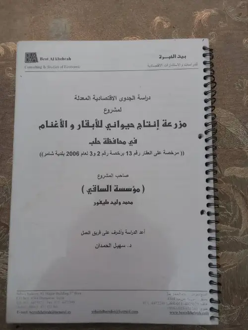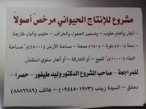 . للبيع او المشاركة مشروع انتاج حيواني ابقار وأغنام ، لانتاج الحليب والألبان والأجبان الطازجة ، وتسمين العجول والخراف لبيعها محلياً وتصديراً .. /مساحة المشروع كامل مساحة الارض ( 45 ) خمس واربعون الف متر مربع الالبيتوني ( 10 ) عشرة آلاف مربع يتألّف من حظائر و مستودعات و مَحلَب + بنائين سكن للموظفين والعمال و مبنى ادارة .. المشروع مرخص بموجب مخططات هندسية ورخصة بناء ، وليس ارض زراعية ( او مزرعه ) المشروع موافق عليه من الجهات المختصة ومرخص اصولاً للانتاجبناء الحيواني ، وهو جديد لم يباشر بالانتاج لتاريخه بسبب الحرب ، منفذ منه 90 % بناء ، وهو قيد الانجاز (المقرّر ) يتم تسليمه للشاري جاهز كامل البناء مع الاكساء داخلي وخارجي مع تنفيذ زفت للطريق الداخلي مع غرس الأشجار على جوانب المشروع .. / يوجد ثلاث آبار ماء مع خزان بيتوني مرتفع سعة 60 متر مكعب جميعها تحتاج الى تجهيز ، ولسوف يتم تجهيزها بعون الله .. / موقع المشروع ..؟ محافظة حلب على اوتستراد دولي شرق حلب باتجاه مدن الباب ، ومنبج ، والحسكه ، والقامشلي ، يبعد عن حلب 18 كم .. ويبعد عن مراكز تسويق الاغنام بحدود 10 كم / المشروع على ارض قرية شامر ، مفرق قرية أعبد ..