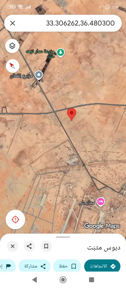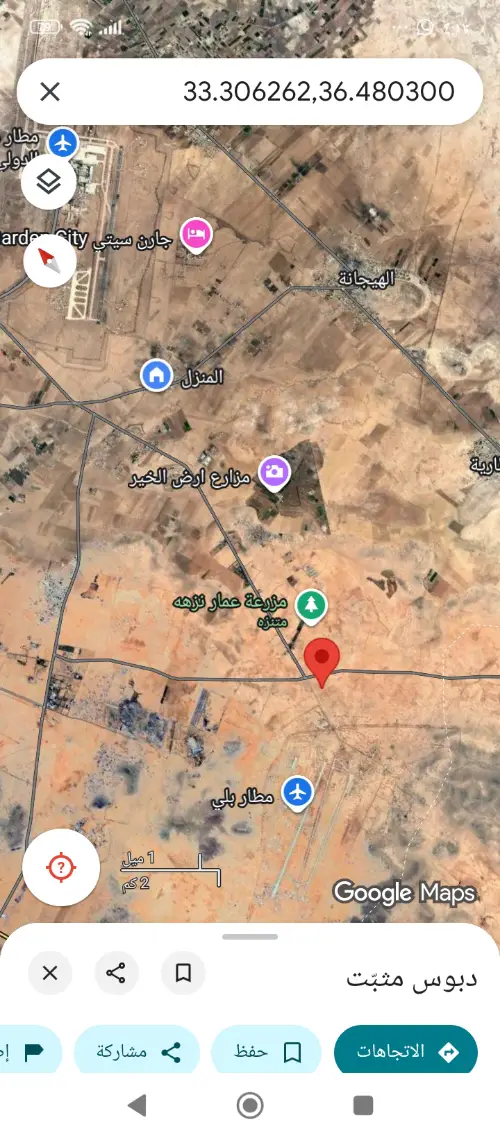 ارض للبيع 800دونم سعر الدونم 300$ اصلاح زراعي عقد بيع قطعي موقع الارض بين مطار دمشق الدولي ومطار بلي تبعد عن مطار دمشق8كيلو