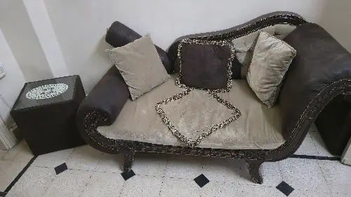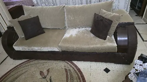 طقم كنبايات مستعمل خشب تقيل جداا فرش بيج مخمل مؤلف من ثلاثية وثنائية ومفردة وشيزلون + طاولتين صغار حالة الطقم وسط