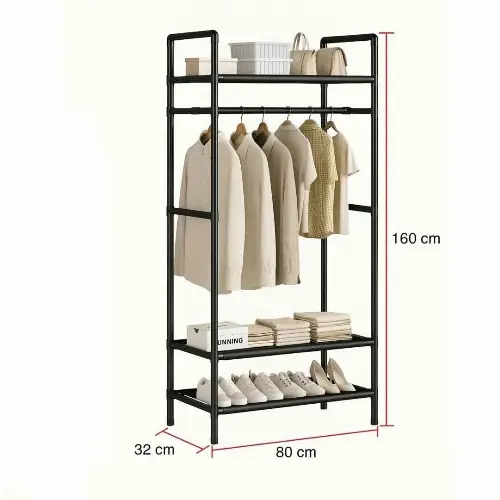 ستاند لتعليق الملابس ولا أجمل 😍❤️ للتنظيم والترتيب واستغلال المساحات 🥰 أعمدة من المعدن المبخوخ حرارياً 😎 مع 3 رفوف قماش للأحذية والصناديق 🤗 سهل الفك والتركيب بدون أي معدات ✅ الأبعاد { الطول 160 - العرض 80 - العمق 32 } سم 🎗 توصيل ضمن الشام وشحن للمحافظات 🚌