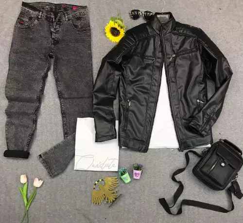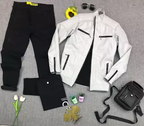 طقم. 3 قطع 1.جاكيت جلد تقييل بطانة فرو من داخل قطعه اورجنال قصه. شبااابيه. تقيييل 2.كنزة. قطن تركي 3.بنطااال جنر . تقيل. المقاااسات. M. L. XL. XXL. واتس 0959199808