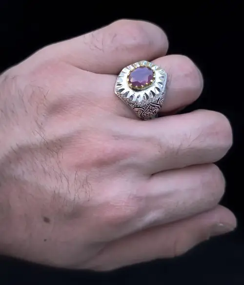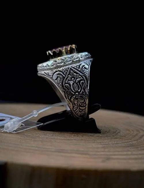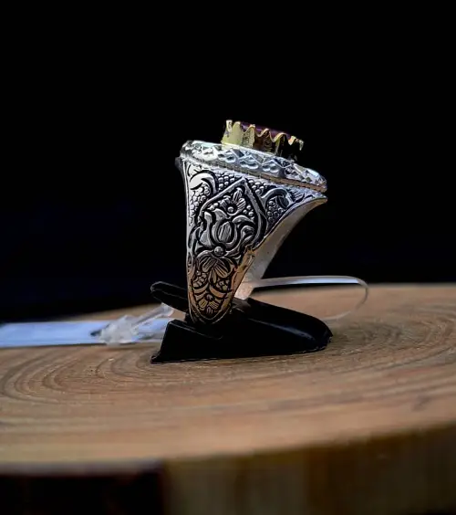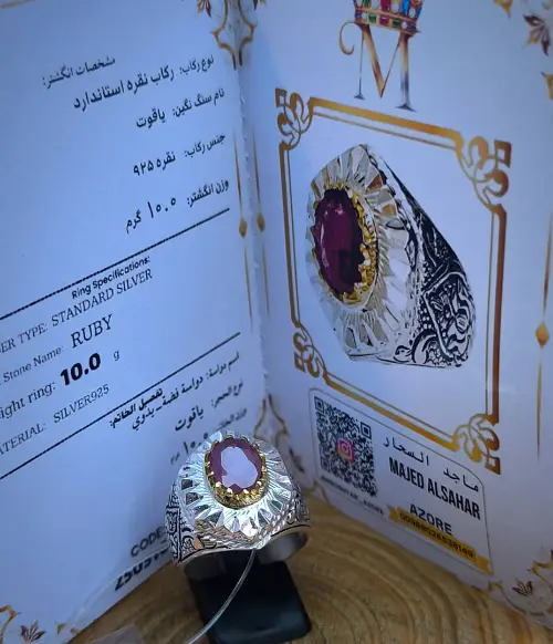 قطعة ملكية 👑 *الوكيل الحصري لشركة AZORE في سوريا و لبنان ماجد السحار* خاتم فضة عيار 925 مختوم بصياغة مميزة يدوية بالكامل حفر يدوي زخرفة يدوية بالكامل متوج بجوهرة الياقوت الأحمر الافريقي الروبي الأصلي نوع اول مع شهادة منشأ للخاتم دفتر القياس 21 قابل للتعديل مأجور وزن 10 غرام 85 دولار