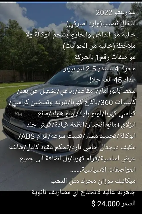 سورينتو ...فل كاملة مسكرة ....عالم من الخيال ....لحق حالك واغتنم الفرصة ....خالية بر جوا ...محرك ودوزان ذهب ...جاهزية ممتازة ...حسان ...11/11...للراغب فقط ...نعتذر من الوسطاء والمكاتب ...عمولة من الشاري ...شكرااا للجمييع ...تحياتي