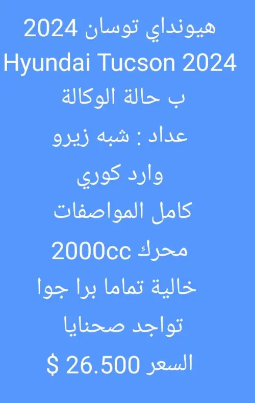 لعشاق الفخامة ....توسان ...خالية برا جوا ....محرك ودوزان ذهب .....جاهزية عالية وممتازة ......لحق حالك واغتنم الفرصة ..........حسان ..18/11.......البيع للراغب فقط ...نعتذر من الوسطاء والمكاتب ...عمولة من الشاري ....شكرا لتفهمكم ........تحياتي ..أ.عمران