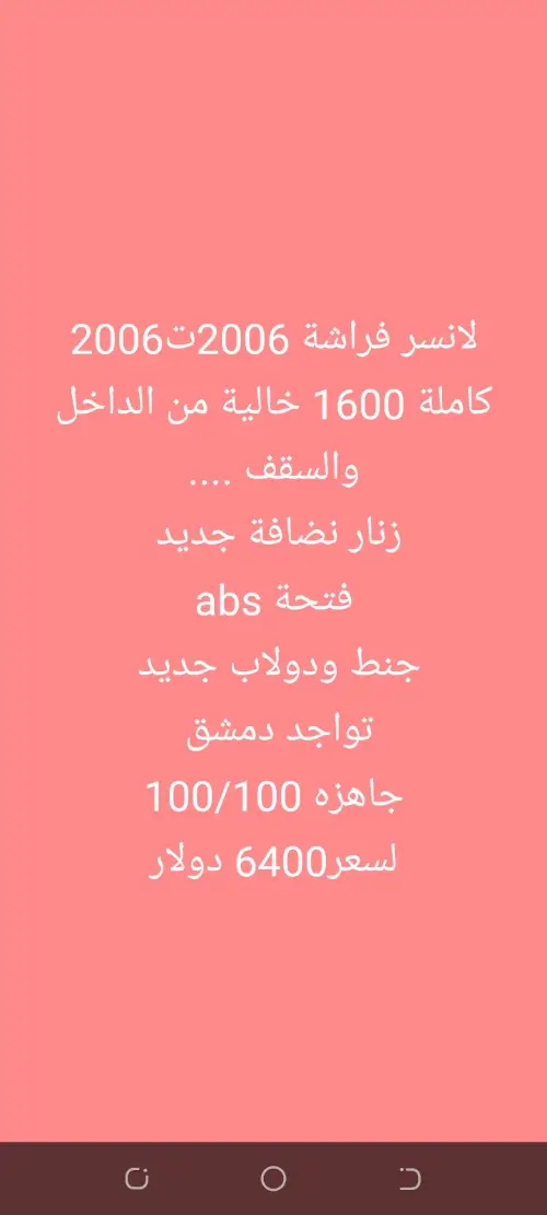 لانسر ....خالية برا جوا ...محرك ودوزان ذهب ...جاهزية ممتازة ...لحق حالك واغتنم الفرصة .....حسان ...2/12...للراغب فقط ...نعتذر من الوسطاء والمكاتب ...عمولة من الشاري ...شكرااا للجمييع ......تحياتي ...أ.عمران