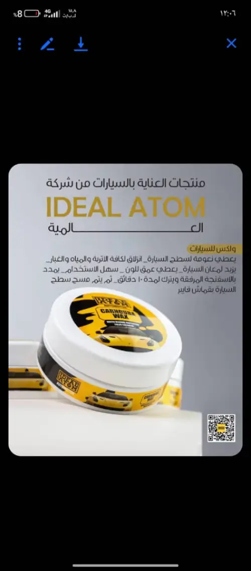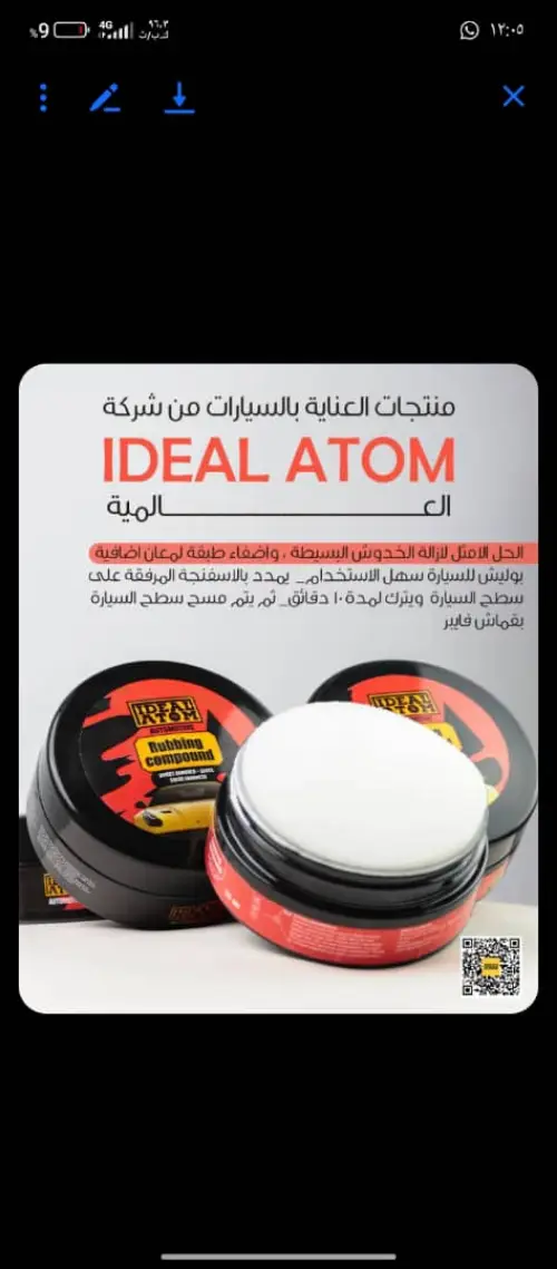 سيارتك تستحق الأفضل! 🤩 قدّمنا لك الحل الأمثل لتُلمّع سيارتك بنفسك وتحصل على نتيجة احترافية: مُلمّع (البوليش) ومزيل الخدوش السطحية الأقوى! من شركة IDEAL ATOM: ✅️إزالة فورية: يزيل الخدوش البسيطة وعلامات المسح التي تظهر مع الغسيل. ✅️لمعة عميقة: يعزز لون السيارة بشكل مذهل. ✅️سهل التطبيق: لا يحتاج لخبرة أو أدوات معقدة. لا تدع الخدوش الصغيرة تقلل من قيمة سيارتك! متوفر الآن بكميات جملة فقط محدودة اطلب الآن ولاحظ الفرق في دقائق! 🚀 للتواصل خاص على بريد الصفحة او whatsapp على الرقم : 0982859698