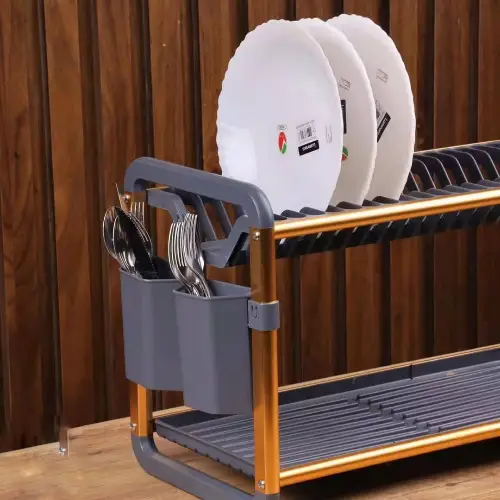 مشك جلي تقيل ومرتب طابقين لونين فضي ودهبي المنيوم مابصدي أبداً مع بلاستيك دبل مقوى اسمو الاسيتال يعني مقاوم للماء والحرارة والخدش والمركبات الكيميائية بالإضافة لدرج لتصفية المياه السعر 300،000