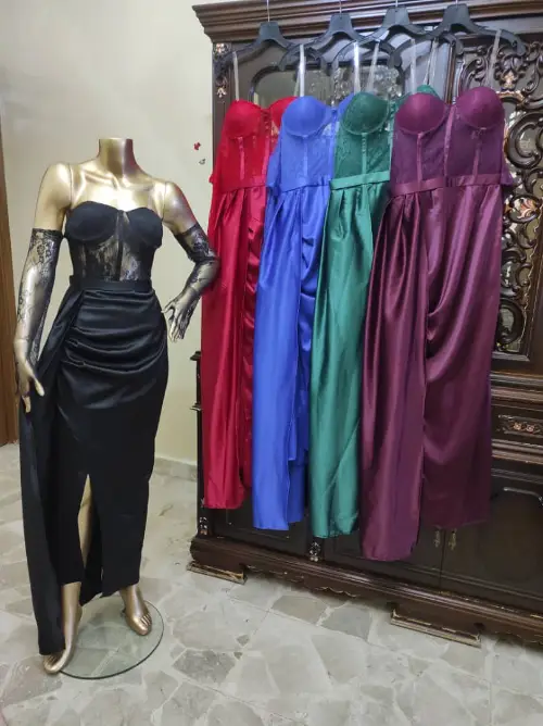 فستان ساتان جيسكا اجنبي + دانتيل كابيه مستور ١/ ٢/ ٣٨/ ٤٠/ ٤٢/ ٤٤/ احمر/اسود/خمري/زيتي/ نيلي/ السعر 285 توصيل بحلب وشحن محافظات