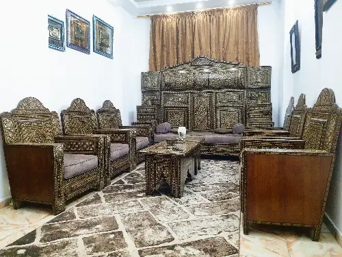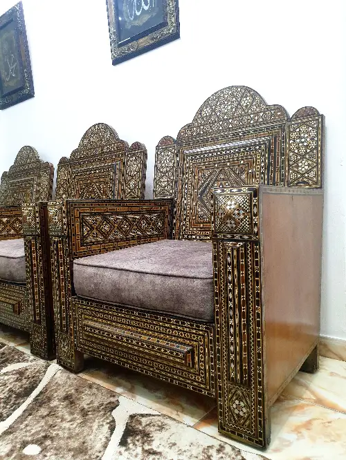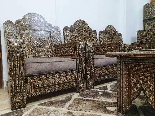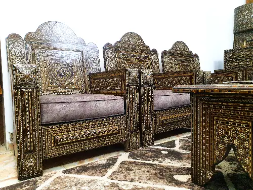 للبيع طقم دمشقي قديم موزاييك وصدف بحري طبيعي وموزاييك أصلي العدد ست كنبايات مفارد وديوان ملكي وطاولات للاستعلام 0995571166