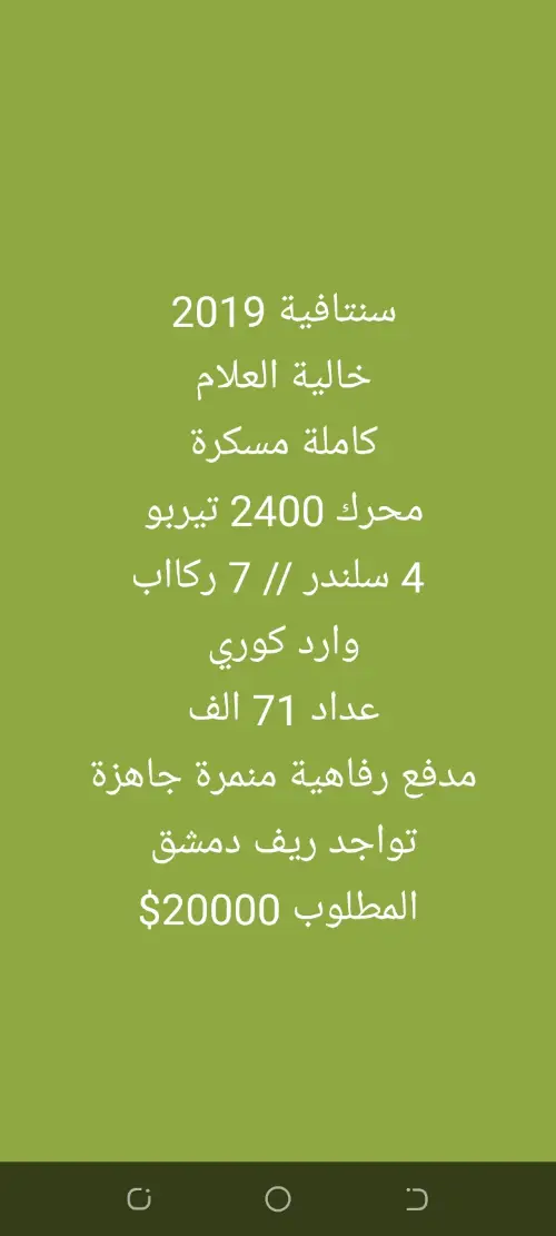 سنتافييه .....خالية برا جوا ...محرك ودوزان ذهب ...جاهزية ممتازة ....بمناسبة الذكرى السنوية للتحرير . لحق حالك واغتنم الفرصة ..... .حسان ...9/12.....للراغب فقط ...نعتذر من الوسطاء والمكاتبب...عمولة من الشاري ... شكرااا لللجمييع .. تحياتي . أ.عمران