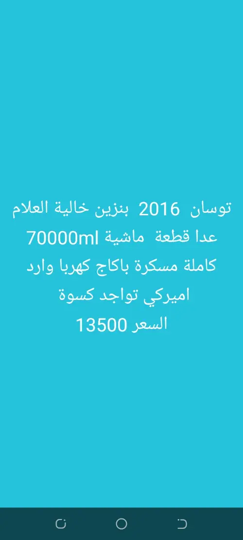 توسان .....خالية برا جوا ...جاهزية ممتازة وعالية جدا ......لحق حالك واغتنم الفرصة ....حسان ...9/12.........محرك ودوزان ذهب ...لللراغب فقط ...نعتذر من الوسطاء والمكاتب ...عمولة من الشاري ...شكراا للجمييع ......تحياتي ..أ.عمران ...