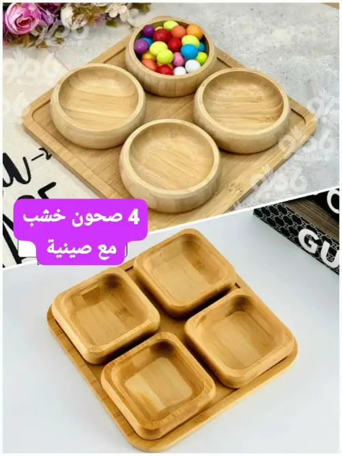 4 صحون خشب مع صينية🥰🎀 موديل دائري او مربع بيسلب العقل ❤️ توصيل ضمن دمشق وريفها وشحن للمحافظات🎀