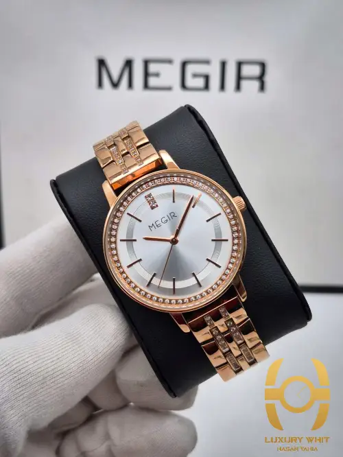 MEGIR QUARTZ HIGH-QUALITY FOR LADY الحركة كوارتز زيركون على إطار الساعة لون ثابت جودة عالية بوكس مع مع كيس كرتون وكرت من الشركة