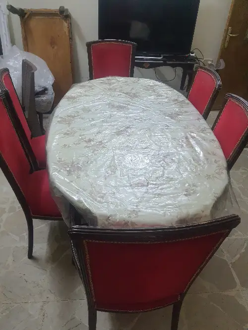غرفة ضيوف لون كحلي مع طاولات مرمر