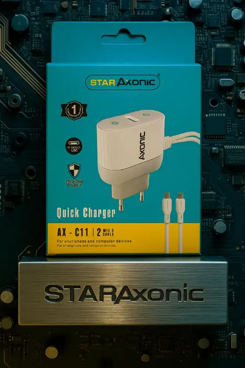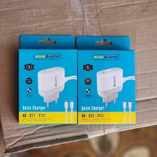 شاحن Ax-C11 من شركة Star Axonic =•=•=•=•=•=•=•=•= 🚩رأسية شحن بقوة 2.4A 🚩كابل للشحن ونقل البيانات × ٢ 🚩مخرج شحن USB مع ضوء اشاره