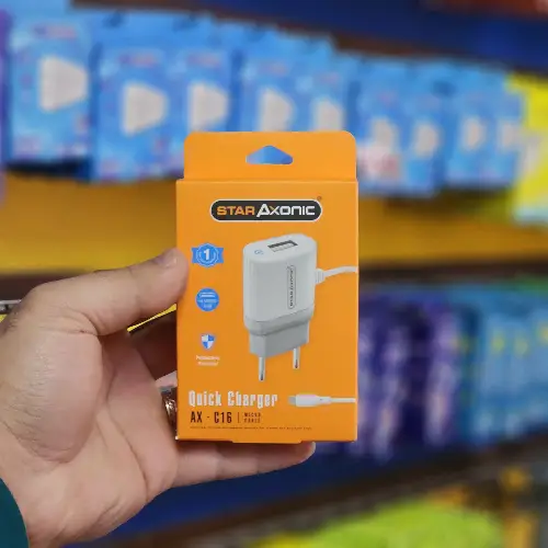 شاحن AX-C16 من شركة Star Axonic =•=•=•=•=•=•=•=•= 🚩رأسية شحن بقوة 1.2 🚩كابل للشحن ونقل البيانات مدمج مع شاحن 🚩مخرج شحن USB