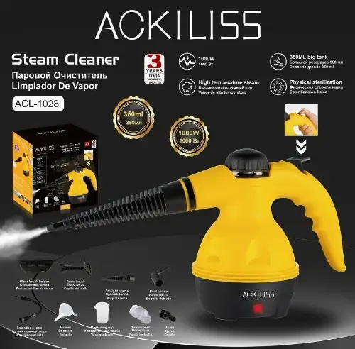 جهاز التنظيف بالبخار ماركة ACKILISS 😍❤️مثالي لتنظيف المطبخ٬ والحمام٬ والنوافذ...✨ضغط البخار 3 بار 💪 الاستطاعة 1000 واط 😎ما عليك إلا تعبئة الخزان بـ 350 مل من الماء 💧وإضافة معقم أو معطر { حسب الرغبة } 🌸يقوم الجهاز بالتسخين السريع خلال 2 دقيقة 🔥قادر على إعطاء البخار لمدة 10 دقائق ⏰مزود بملحقات متعددة الاستخدامات 😍1⃣ أنبوب مرن للوصول إلى الأماكن الصعبة2⃣ فوهة عريضة للأسطح الواسعة3⃣ ملحق لتنظيف الزجاج والنوافذ4⃣ قطعة قماشية للتلميع5⃣ أنبوب زاوية للأماكن الضيقة 6⃣ فرشاية دائرية صغيرة للفرك7⃣ فوهة مستقيمة لزيادة التركيز8⃣ كأس معياري مع قمع لسهولة التعبئةتوصيل ضمن الشام وشحن للمحافظات 🚌