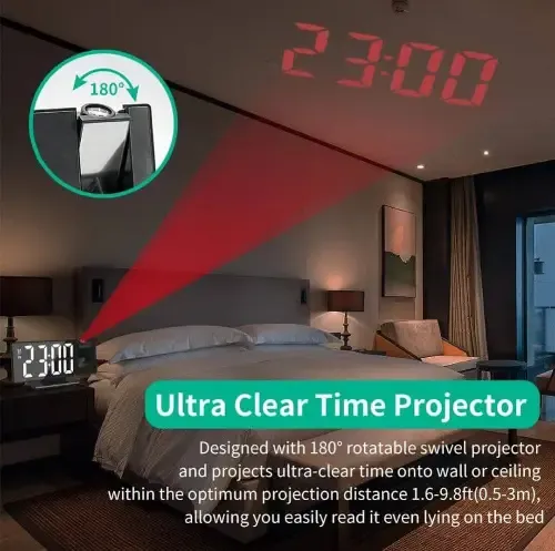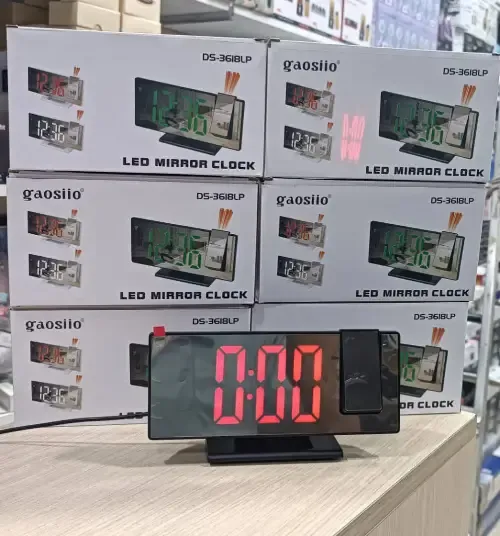 ساعة مرآة LED من طراز Gaosiio DS-3618LP مع جهاز عرض مدمج. تتميز بشاشة LED كبيرة يمكن استخدامها كمرآة. تتضمن وظائف مثل منبه مع غفوة، وتقويم (يوم، شهر، سنة)، وميزان حرارة. تحتوي على جهاز عرض مدمج يمكنه عرض الوقت على الحائط أو السقف، مع إمكانية الدوران 180 درجة. يمكن تشغيلها عبر USB أو باستخدام بطارية CR2032، وتوفر مستويات سطوع قابلة للتعديل. السعر 160،000 او 1،600