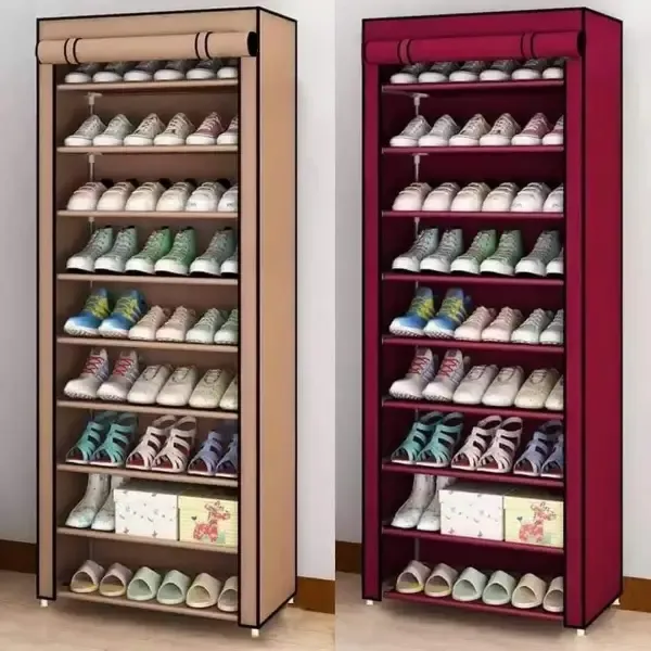 خزانة أحذية مصنوعة من القماش لتنظيم الأحذية واستغلال المساحات 9 رفوف، تتسع لـ 27 زوج من الأحذية أعمدة من الستانلس المقاوم للصدأ والكسر غطاء سحاب قابل للفتح والتثبيت الأبعاد { 158 × 30 × 58 } سم الألوان { رمادي - خمري - بني }