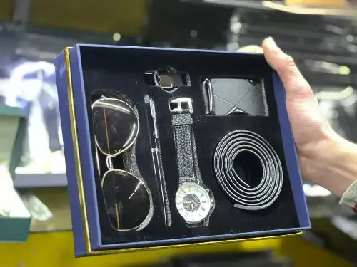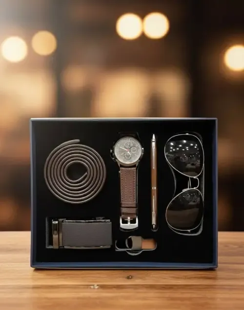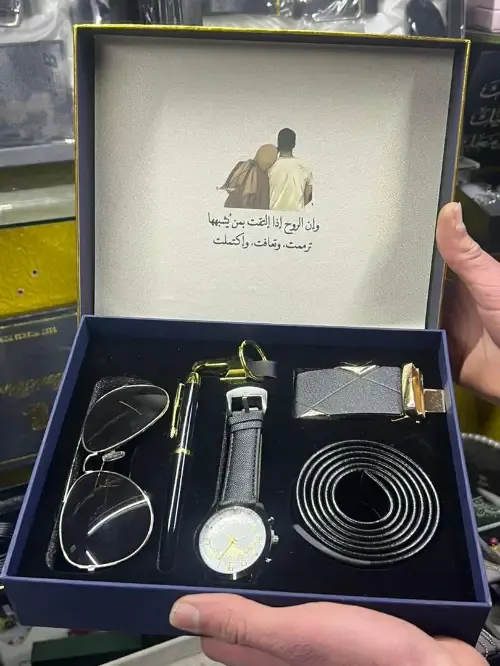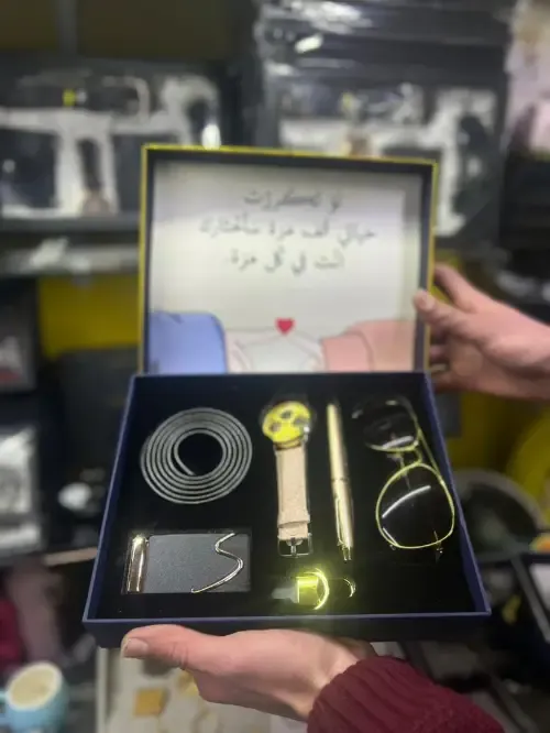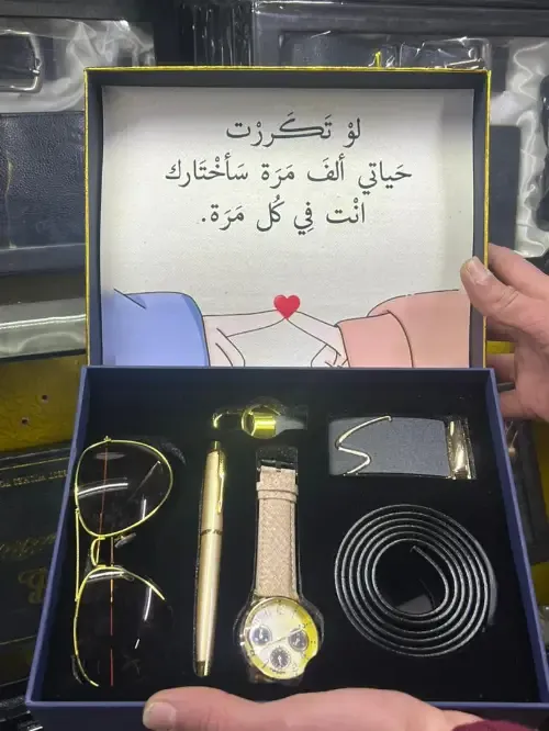 البوكس الملكي 3 موديلات بوكس رجالي اكابري 5 قطع ساعة وجزدان قلم وقشاط ونطارات او ميدالية والبوكس مرتب ممكن حفر ليزر عالقلم وعالجزدان كمية بحررر 270000 مع طباعة صورة ع الغطا من جوا B