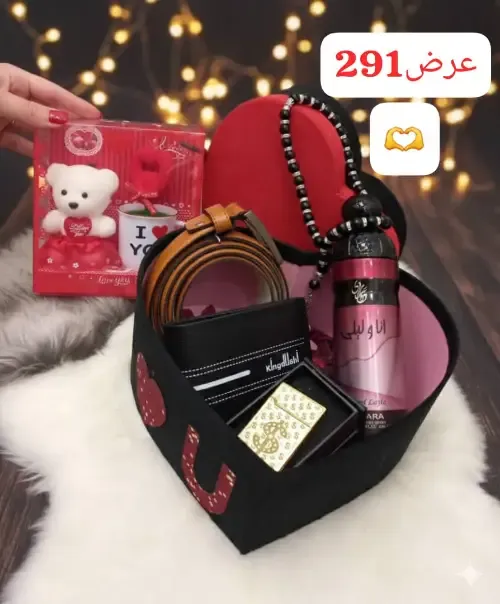 هديه عيد الحب البوكس الملكي🫰🏻❤️ بوكس رجالي كامل متكامل لعيد الحب 1 بوكس على شكل قلب مع ورد مجفف 2 قداحه شي فاخر وقابل للتعبائه 3 جزدان رجالي تقيل 4 دودران ريحة تجننن 5 مسبحه تقيله محليه بالالماس 6 علبه اضافيه مع البوكس فيها دبدوب مع فنجان قهوة 7قشاط رجالي لون من اختيارك كحلي.بني.عسلي.اسود السعر 350000 توصيل ضمن الشام وشحن للمحافظات W