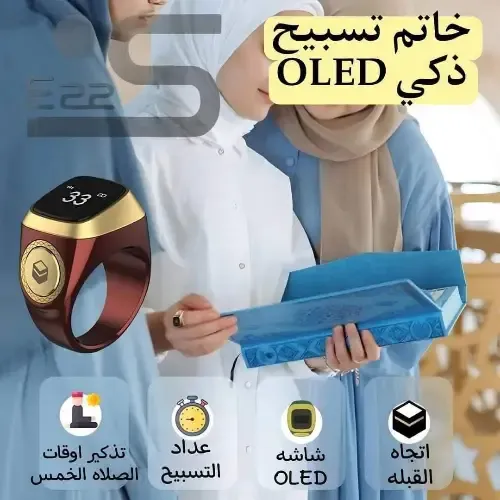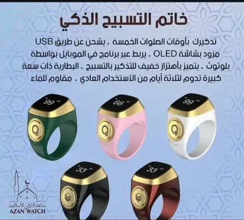 خاتم التسبيح الذكي الأول في العالم بخاصياته المميزة 💠💎-خاتم التسبيح الالكتروني يتمتع بشاشة OLED.💎- بلوتوث مدمج 5.1.💎 يقوم بتذكيرك بأوقات الصلوات الخمسة.💎- يتميز باهتزاز خفيف للتذكير بالتسبيح.💎- أيضاً اهتزاز وقت التسبيح للتنبيه عند رقم 33 – 66 – 99.💎- يمكن الحصول بلمسة زر على تخطيط وتسجيل التسبيح والذكر اليومي في أي وقت وفي أي مكان.💎- له عداد تسبيح مرن والذي يمكنك من تسجيل عدد التسبيحات التي تم تسجيلها مسبقا فإن رنين الذكر سيهتز ويعرض الرقم على الشاشة.💎- البطارية ذات سعة كبيرة 3 أيام من الاستخدام العادي.💎- خاتم التسبيح مقاوم للماء والغبار بمعيار ip68.💎- علبة لشحن الخاتم و تشحن العلبةمتوفر ب مقاس 20 فقط ✅متوفر ب 4 ألوان ألوان زهري ، كحلي ، أسود ، زيتي ❄️توصيل ضمن الشام وشحن للمحافظات 💙 السعر 230000