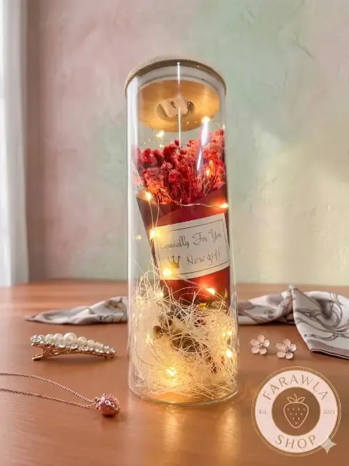 أضف لمسة من السحر والأناقة الدائمة إلى مساحتك مع هذه التحفة الفنية من Farawla Shop. باقة من الورود الطبيعية المحفوظة (Preserved Roses) في قبة زجاجية مضيئة، تجمع بين جمال الطبيعة والتصميم الحرفي الأنيق. تصميم حصري لفترة محدودة، قطعة ديكور استثنائية أو هدية فاخرة تدوم طويلاً.