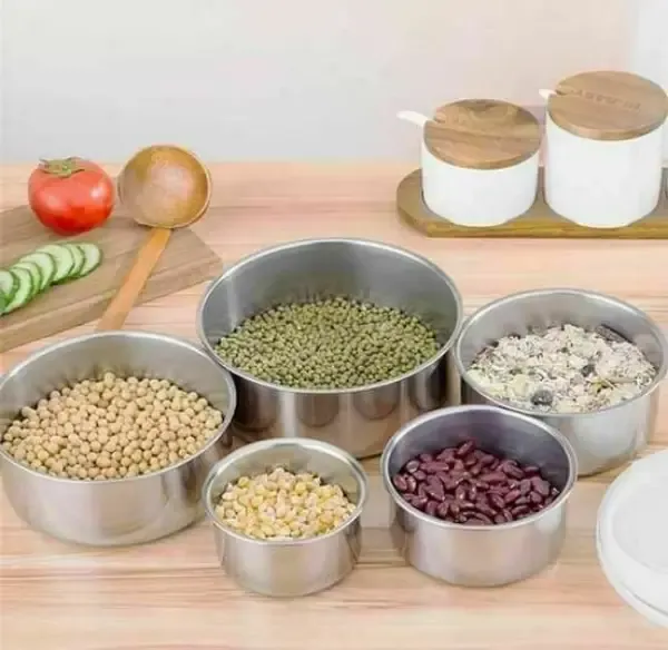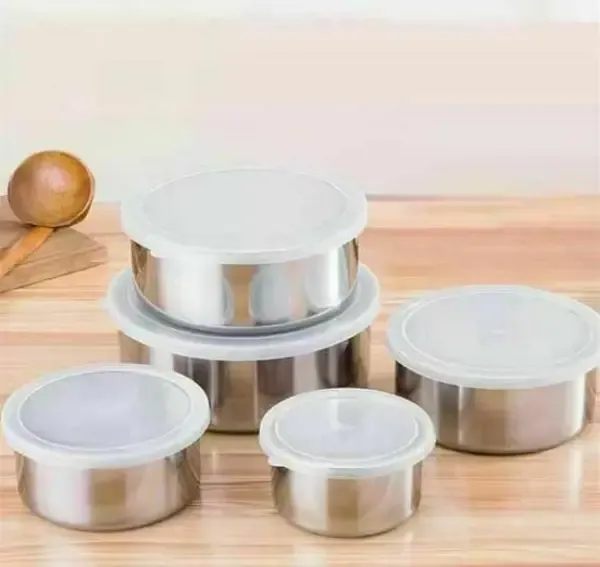 طقم تبروير 5 حافظات ستانلس {{ صغيرة }} مع أغطية بلاستيكية حافظة للحرارة ⭐️ مقاسات الحافظات 1⃣ القطر 18 سم - العمق 6.5 سم 2⃣ القطر 16 سم - العمق 5.5 سم 3⃣ القطر 14 سم - العمق 5 سم 4⃣ القطر 12 سم - العمق 4.5 سم 5⃣ القطر 10 سم - العمق 4 سم