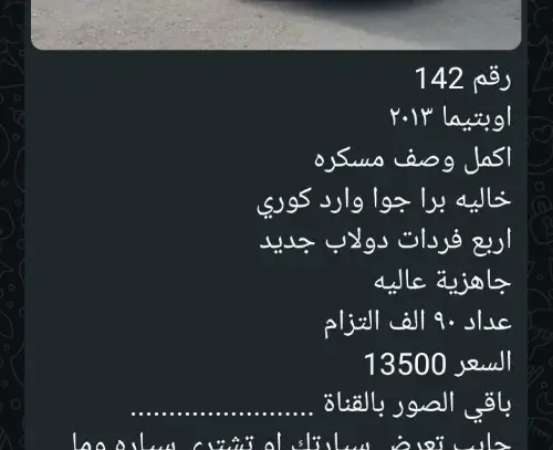 اولتيما ...ملكية ......خالية برا جوا ....وارد كوري.....جاهزية ممتازة ...محرك ودوزان ذهب ...جاهزية فنية وميكانيكية عالية ....سالم ..26/3....للراغب والجاد فقط ...نعتذر من الوسطاء والمكاتب ...عمولة من الشاري ....شكراااللحميع ......تخياتي