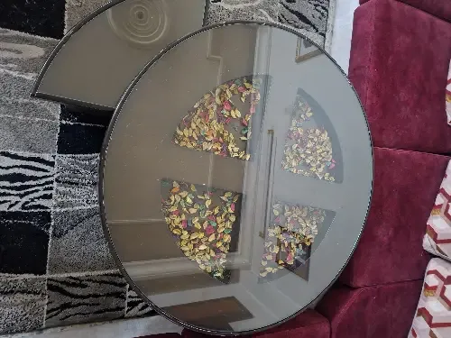 الطاولة مستعملة بس نضيفة بيجي معها اربع طاولات متل اللي بالصورة بتندمج معها وسطحها قزاز مرتبة وانيقة بتعطي مظهر حلو وعصري للصالونات الكبيرة مع طقم لف مناسبة جدا بتكون