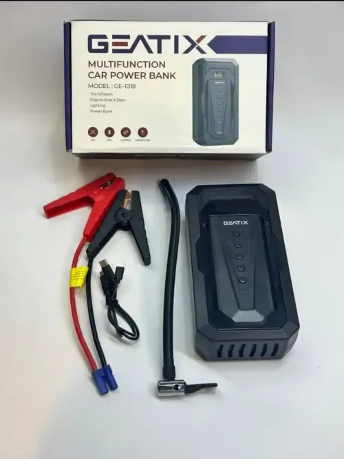 بوربنك طاقة متعدد الوظائف للسيارة من ماركة GEATIX، موديل GE-1018. الوظائف: يعمل كشاحن متنقل للبطارية (Jump Starter)، ومنفاخ هواء للإطارات، وكشاف إضاءة للطوارئ. المواصفات: يتميز بقدرة تشغيل عالية للسيارات، ويأتي مع ضاغط هواء مدمج. المميزات: يأتي بتصميم مدمج يتضمن جميع الأدوات اللازمة لحالات طوارئ السيارة في حقيبة واحدة. السعر 280،000 دهب3،