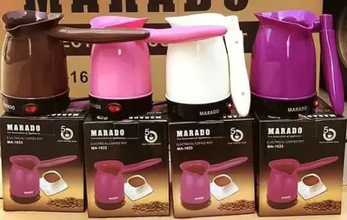 ركوة قهوة MARADO كهربائية لقهوة عربية أصيلة ☕تعمل بالكهرباء بسهولة في المنزل أو المكتب 🔌سعة 0.5 لتر واستطاعة 600 واط لطبخ سريع 💪جسم بلاستيك مقاوم للحرارة آمن وثابت 🔥قاعدة ستانلس ستيل داخلية سهلة التنظيف والصحة 🧼نظام أمان يمنع التسخين بدون ماء لحماية الجهاز ✋لون زهري أنيق يضفي لمسة جمالية على مطبخك 🌸تحضير قهوة تركية وعربية بلمسة واحدة سريعة ⚡اقتصادية توفر وقتك وتكلفة الغاز اليومية 💰توصيل ضمن الشام وشحن للمحافظات 🚛 السعر 125000