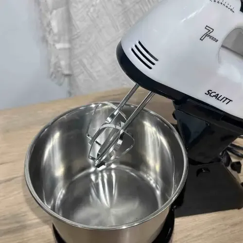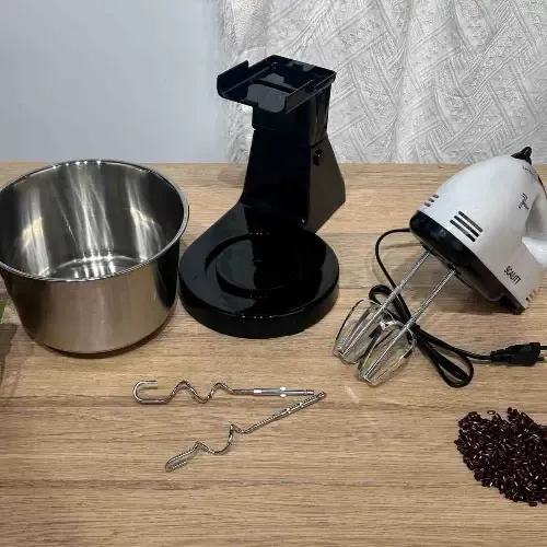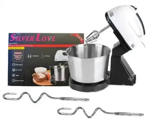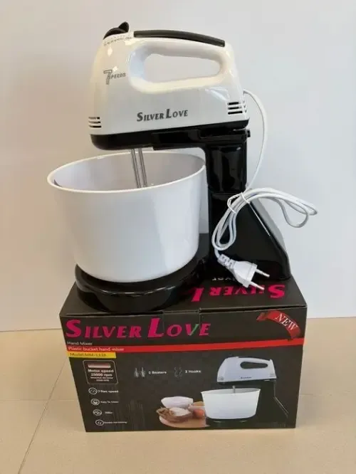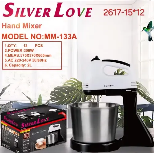عجانة مع قاعدة Silver Love نموذج MM-133A 🥣 وعاء ستانلس ستيل لامع سعة 2 لتر كبير 🥣 قوة 300 واط مع 7 سرعات للتحكم بالخفق ⚡ يتضمن مضارب خفق وخطافات عجن للدقيق 🥟 مثالي لتحضير الكيك، الشوربات، والعجين 🎂 تصميم أنيق أبيض وأسود يناسب كل المطابخ ✨ يوفر الوقت والجهد ويجعل الطبخ متعة ⏳ توصيل ضمن الشام وشحن للمحافظات 🚚 السعر 225000