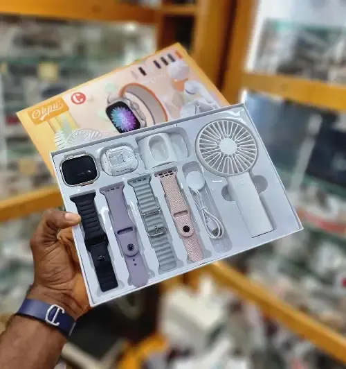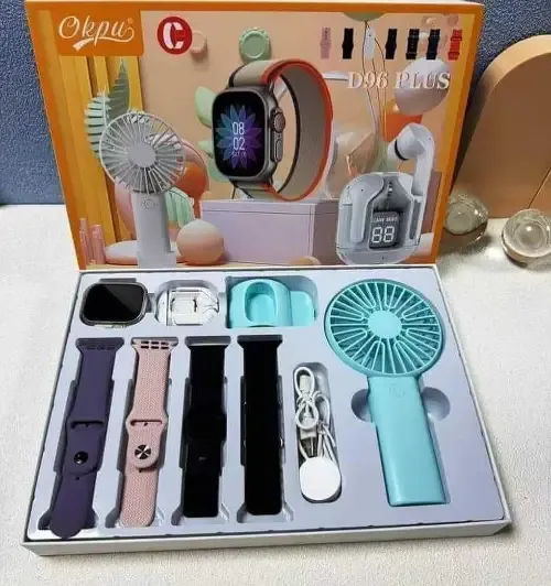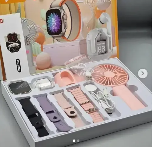 مجموعة D96 Plus الأنيقة بكل ما تحتاجه 🎁 ساعة ذكية بشاشة ملونة وواضحة جداً ⌚ تأتي مع 4 أساور بألوان عصرية جذابة 🎨 سماعات لاسلكية بعلبة شحن رقمية مميزة 🎧 مروحة يدوية محمولة لبرودة وانتعاش فوري 🌬️ رفيقك المثالي في السفر والنزهات الصيفية ✈️ تجمع بين التكنولوجيا الحديثة والراحة العملية 📱 هدية متكاملة وعصرية تناسب جميع الأذواق 🎁 توصيل ضمن الشام وشحن للمحافظات 🚛 السعر 200000