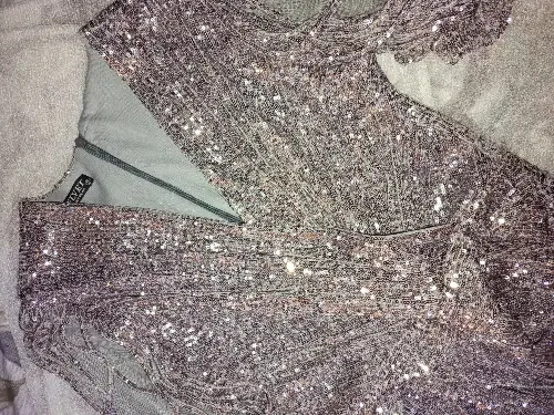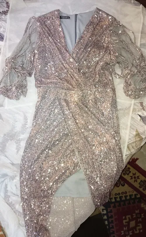 فستان سهرة جويل مع شقة فضي بريق لماع مابوس لبسة واحدة فقط من جهاز عروس تلت أرباع الكم موظيل وللجادين حبة سكر