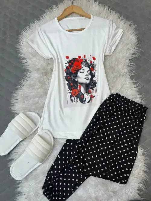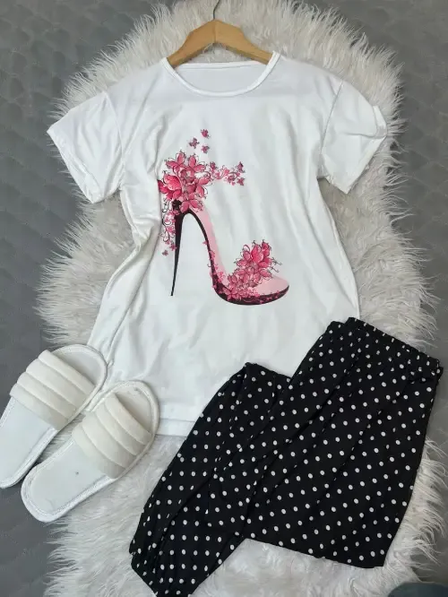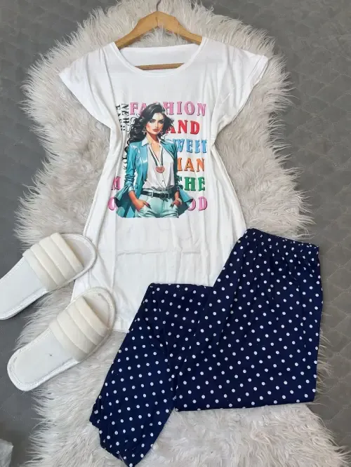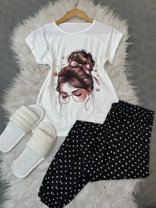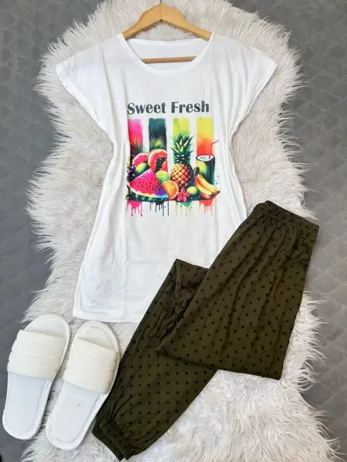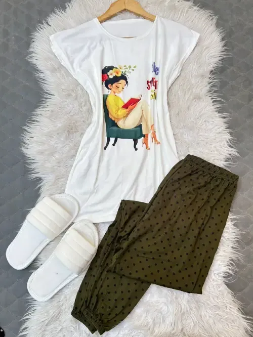 بيجامة قطن سوزيت اجنبي 3 قطع 1- بنطلون بوي فرند عريض زمة من تحت 2- بلوزة ابيض طباعة ديجتل 3- شحاطة ابيض مقاس ستاندر بلبس للاكس لارج والسعر130 ألف