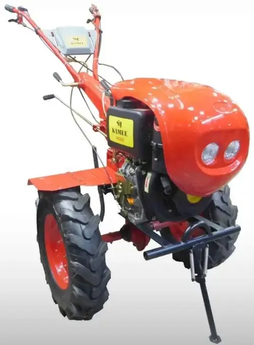 المواصفات الفنية (Kama KDC1231): نوع المحرك: ديزل (S192FE) بقوة 12 حصان. نظام التشغيل: تشغيل كهربائي (مارش) مع وجود خيار للتشغيل اليدوي (هندل). ناقل الحركة (الجير): يعمل بنظام التروس (شنيور)، ويحتوي على 4 سرعات (3 سرعات للأمام + سرعة واحدة للخلف). عرض العمل (العزق): يتراوح بين 100 إلى 130 سم تقريباً، وهو قابل للتعديل. عمق العمل: يصل إلى حوالي 30 سم في التربة. الإطارات: مجهزة بإطارات كبيرة قياس 600x12 لتسهيل الحركة في الأراضي الوعرة والطينية. الإضاءة: مزودة بكشافات أمامية مزدوجة للعمل في ظروف الإضاءة المنخفضة. مميزات إضافية: الكفاءة: محرك الديزل يوفر قوة سحب عالية مع استهلاك اقتصادي للوقود مقارنة بمحركات البنزين. نظام التبريد: تبريد هواء قسري لضمان استمرارية العمل لفترات طويلة. التحكم: مقبض توجيه قابل للتعديل ليناسب راحة المستخدم أثناء العمل.