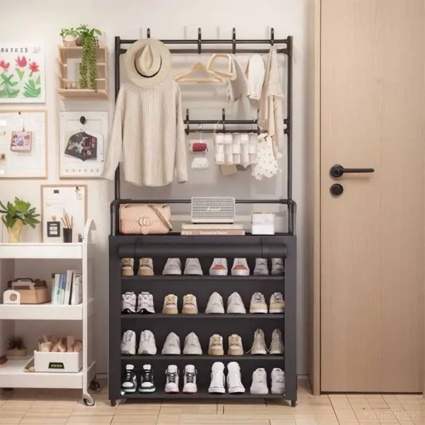 خزانة أحذية قماش مع علاقة ملابس للتنظيم والترتيب واستغلال المساحات أعمدة من المعدن المبخوخ حرارياً غطاء قماشي قابل للفتح والتثبيت مع صفين علاقات للملابس والأغراض سهل الفك والتركيب بدون أي معدات { الطول 171 - العرض 80 - العمق 26 } سم