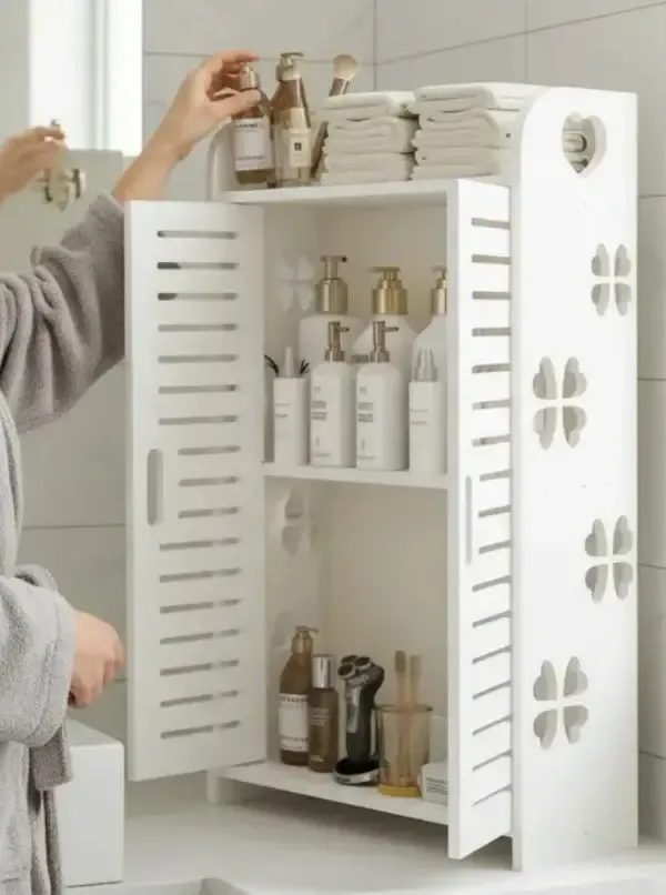 صيدلية حمام ولا أجمل لترتيب أدوات النظافة والإكسسوارات مكونة من رفوف مع فتحات لتفريغ الماء مع أبواب للفتح والإغلاق يمكن تعليقها بالجدار بسهولة الأبعاد { الطول 34 - العرض 14 - الارتفاع 62 } سم